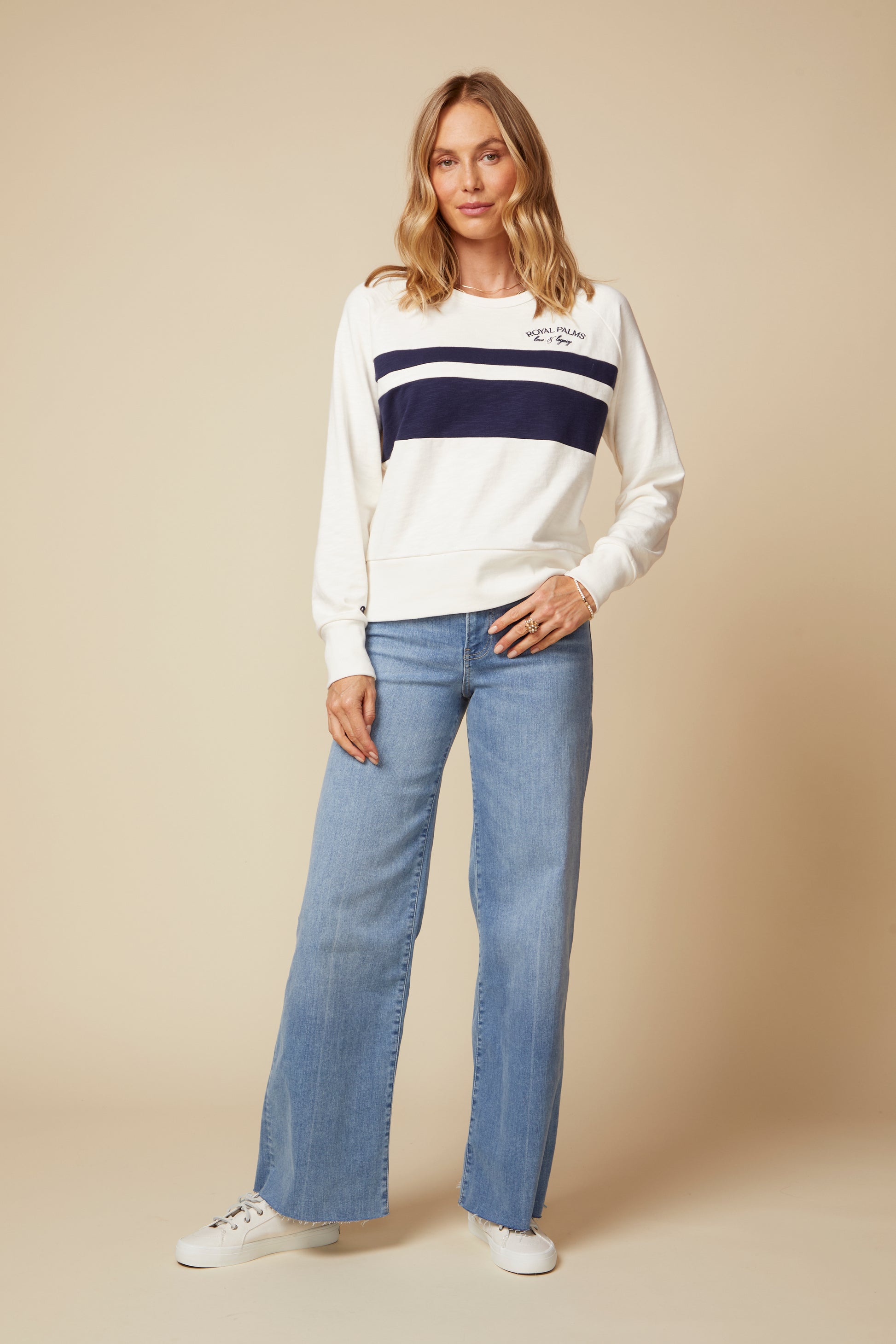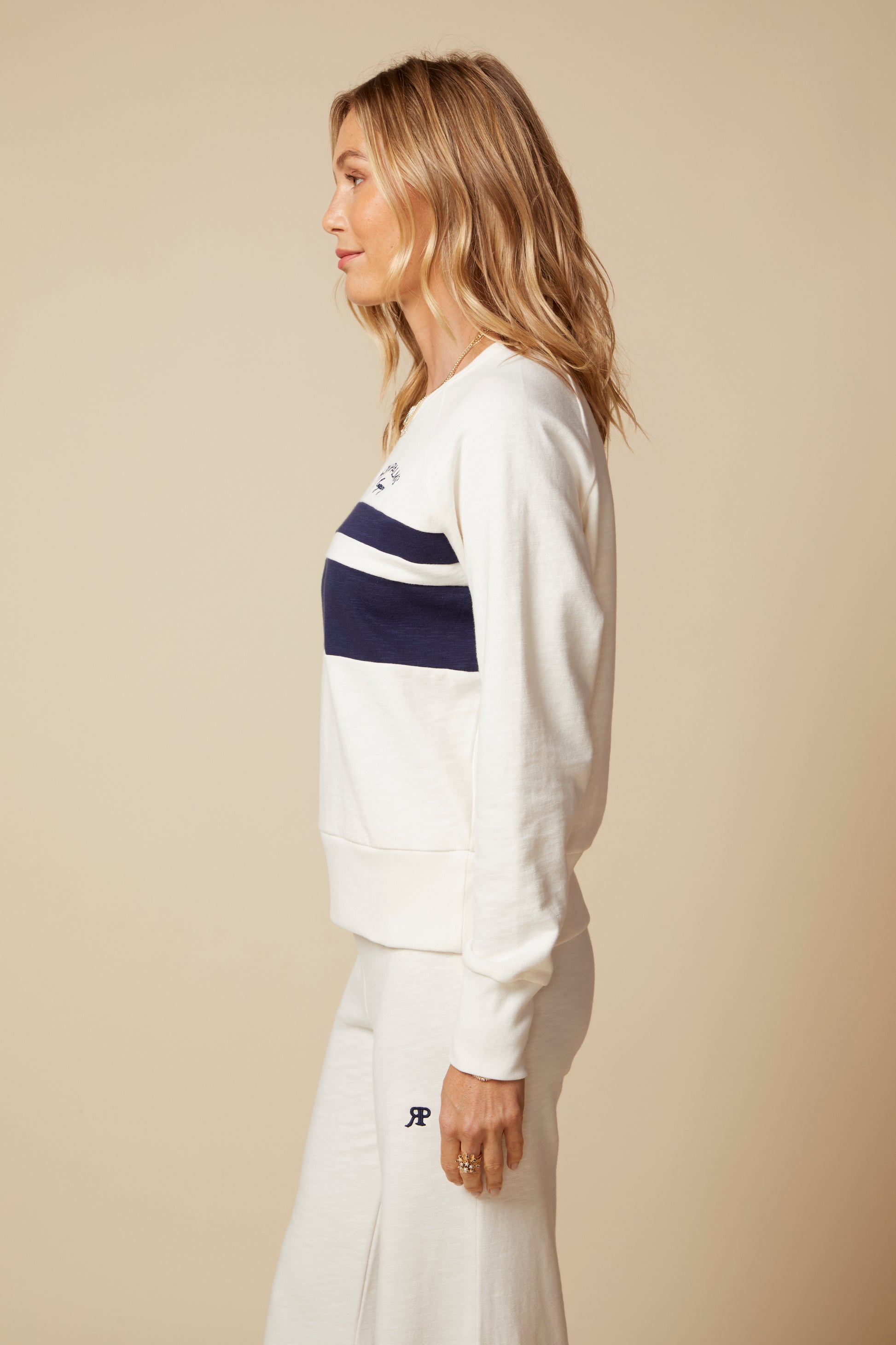 The Sabine Pullover Will Put A Smile On Your Face; In 100% Slub Cotton French Terry, The Hand Feel Is Sublime; It Features Vintage Inspired Collegiate Color Blocked Stripes and Signature Embroidery That Makes This and Instant Classic; Semi Cropped, With Long Sleeves, The Fit Is Flattering And Supremely Comfortable. Pair Back to The Matching Kate Pant for an Elevated Lounge Look.