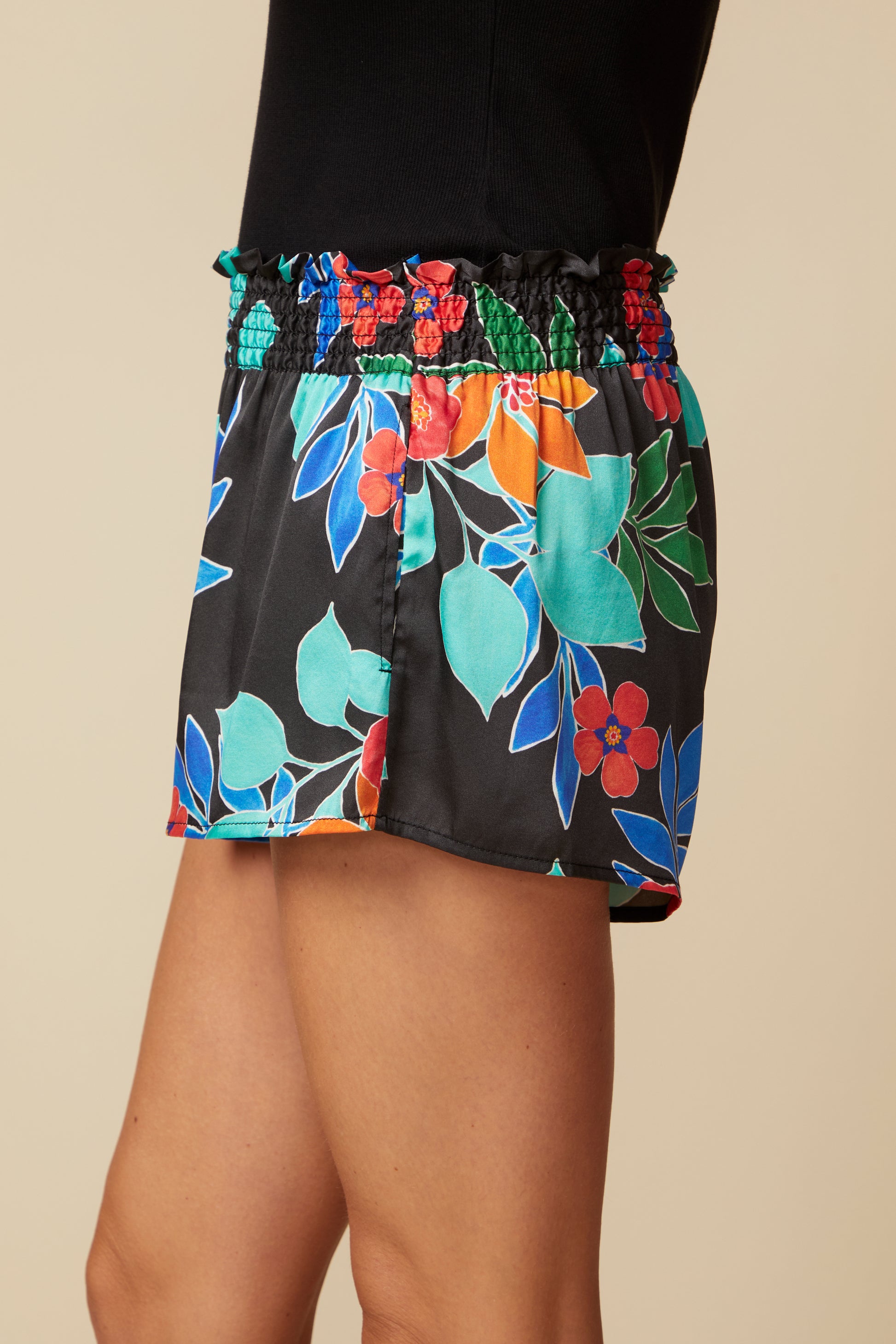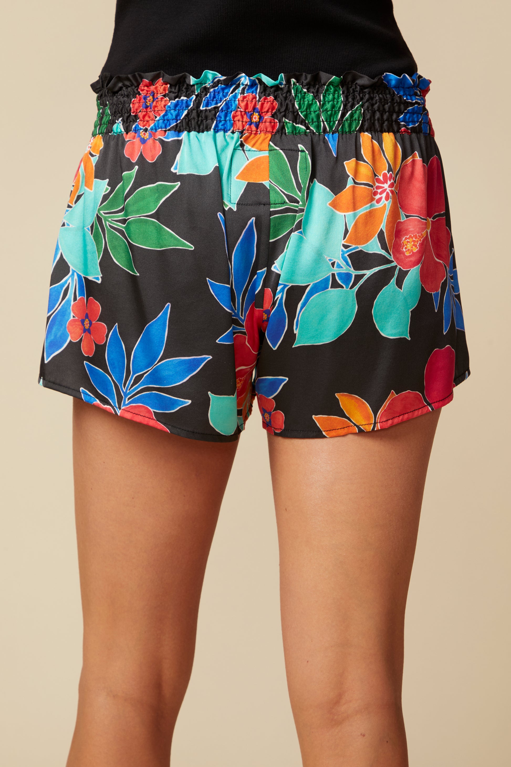 Never Has A Pair Of Shorts Felt So Good; Our Stretch Silk Charmeuse Has Been Washed To Perfection. Easy To Slip On, The Jayne Flounce Shorts, Feature A Decorative Smocked Waistband; Cut to Just the Right Length, These Shorts Are Great For a Day On The Town, at the Pool Or Luxuriously Lounging At Home. In our Whimsical Capri Floral Print, These Shorts are Even More Unique And Resort Ready! Pair Them Back to The Silk Dayna Cami in the Matching Capri Print, The Black Sidney Tee or the Molly Linen Tank.
