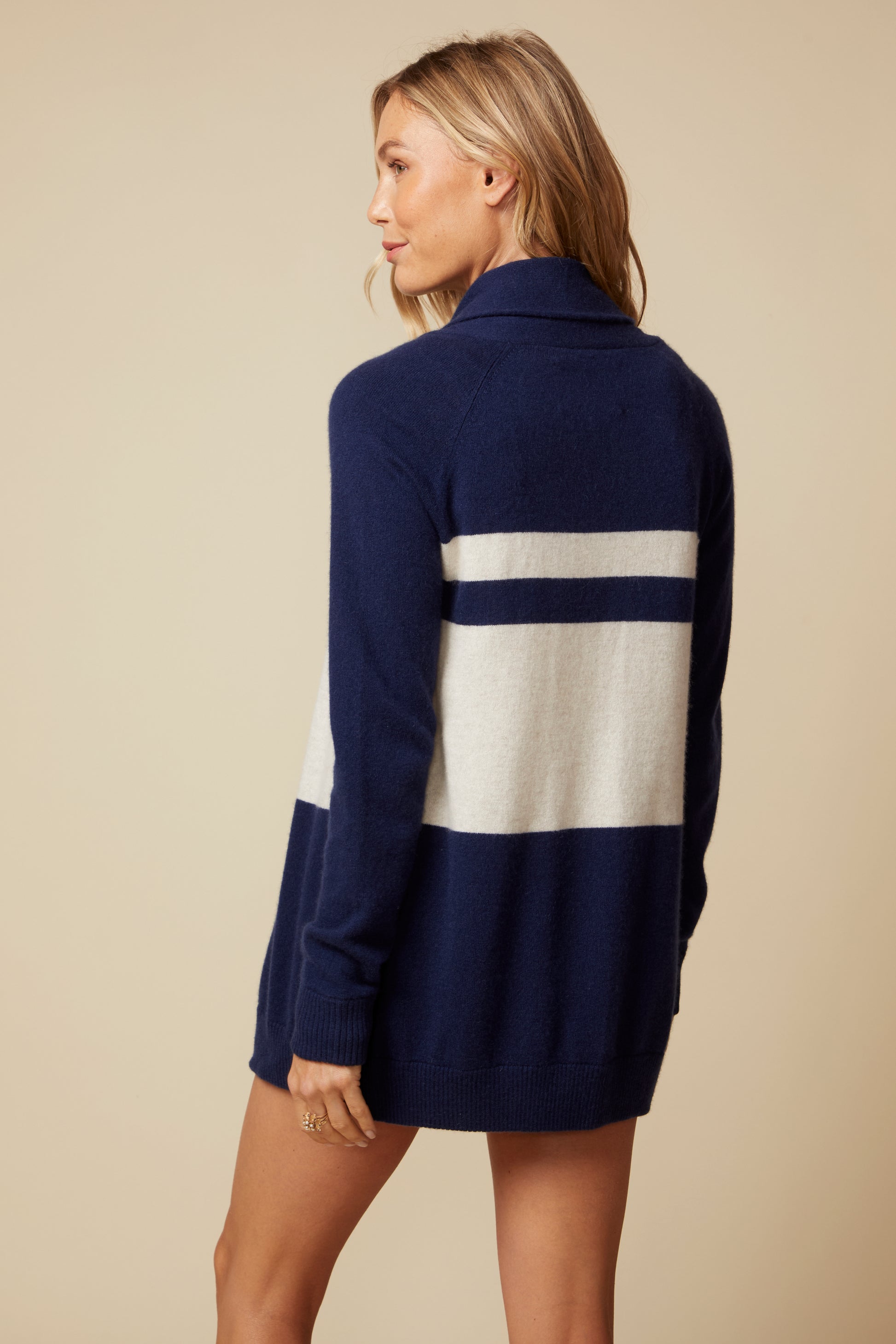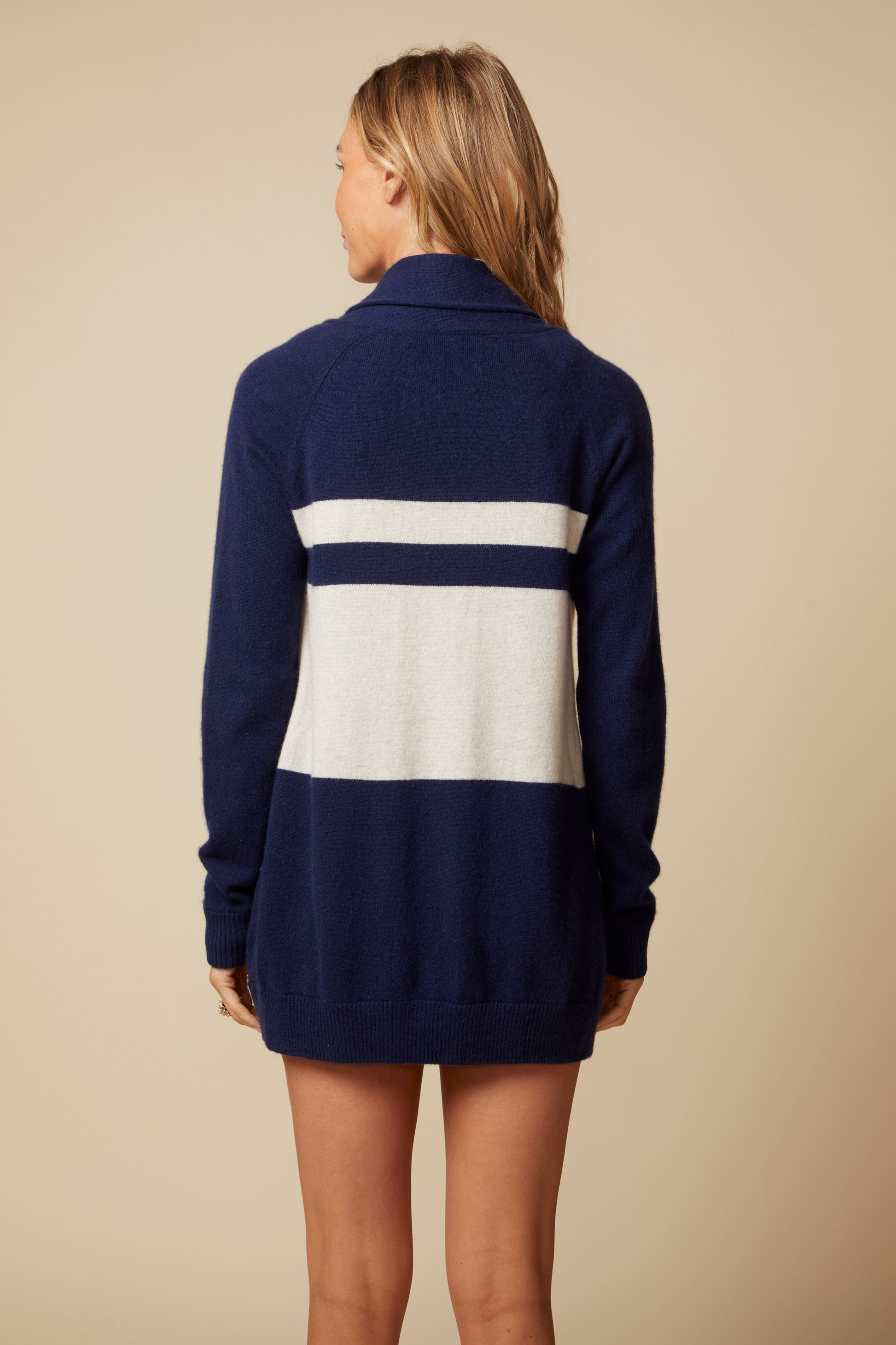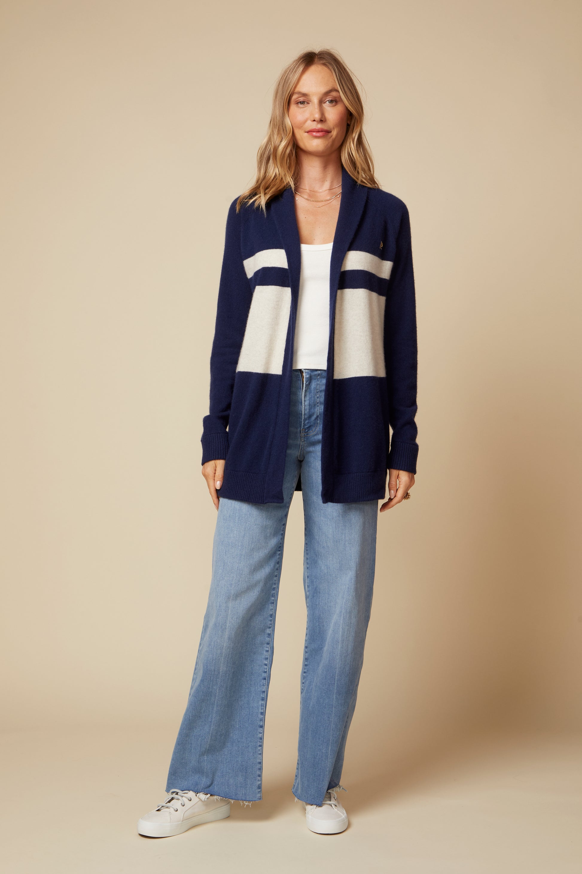 THE JOCELYN CASHMERE SHAWL COLLAR OPEN CARDIGAN IN NAVY & LIGHT OATMEAL STRIPE