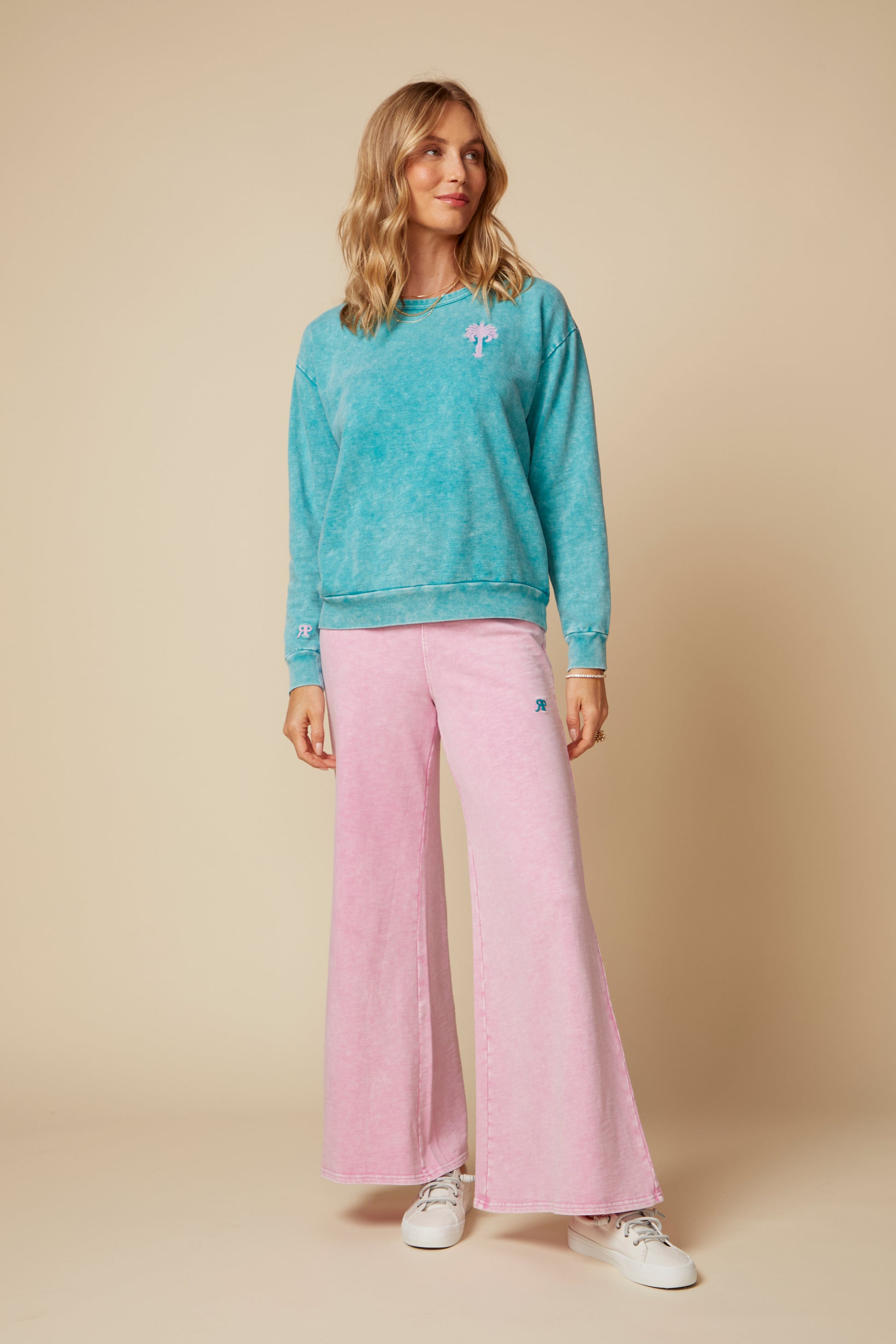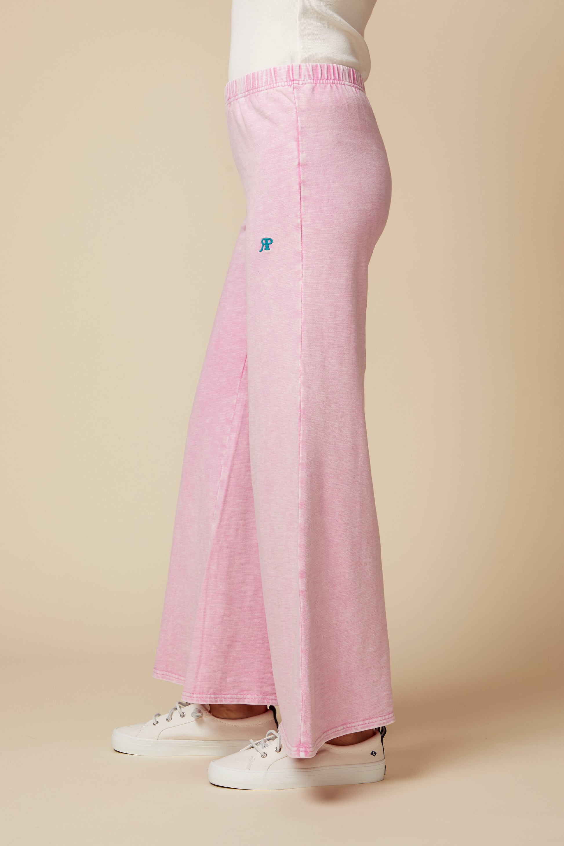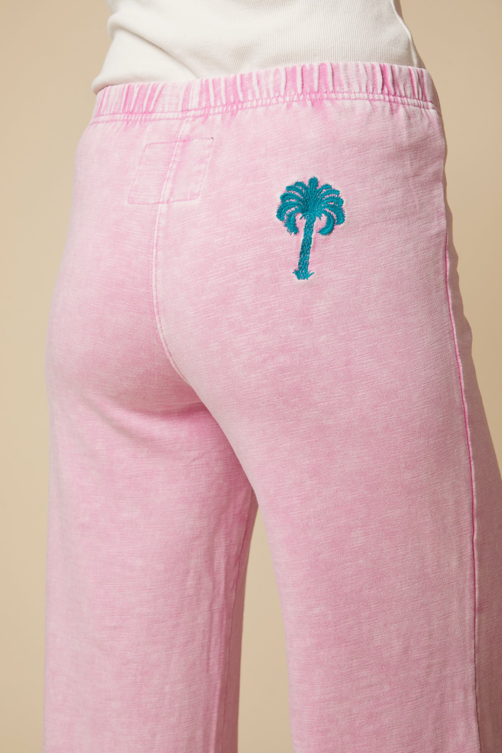 Never Has a Pair of Sweatpants Been So On the Mark. While Casual and Comfy, the Katie Pants are Not Only Stylish but Flattering, an Update to the Kate Pant. The Katie has is ankle length and has a 7/8 inseam. Featuring an Easy, Pull on Waistband That is Lightly Gathered, with a Wide Leg, the Kate will Take Your Lounge Days to the Next Level. The Soft Pink Color with Stone Wash Brings a Feminine Flair to this Style. A RP and Palm Tree Logo Embroidery Details Add Finesse.