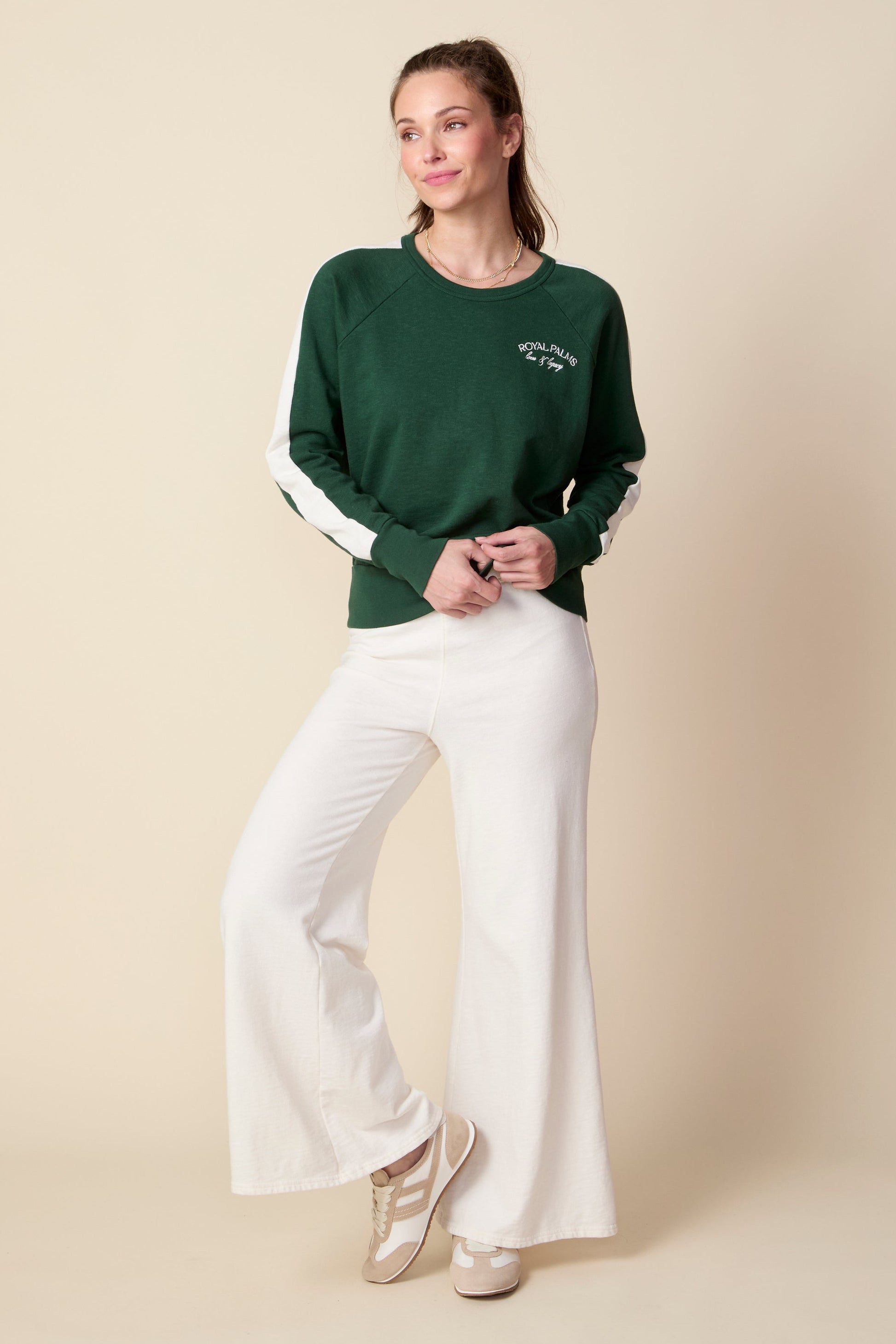 The Kelly Pullover Will Put A Smile On Your Face; In 100% Slub Cotton French Terry, The Hand Feel Is Sublime; It Features Vintage Inspired Collegiate Color Blocked Stripes and Signature Embroidery That Makes This and Instant Classic; Semi Cropped, With Long Sleeves, The Fit Is Flattering And Supremely Comfortable. Pair Back to The Matching Kyle Pant or the Cream Katie Pant in Gardenia for an Elevated Lounge Look.
