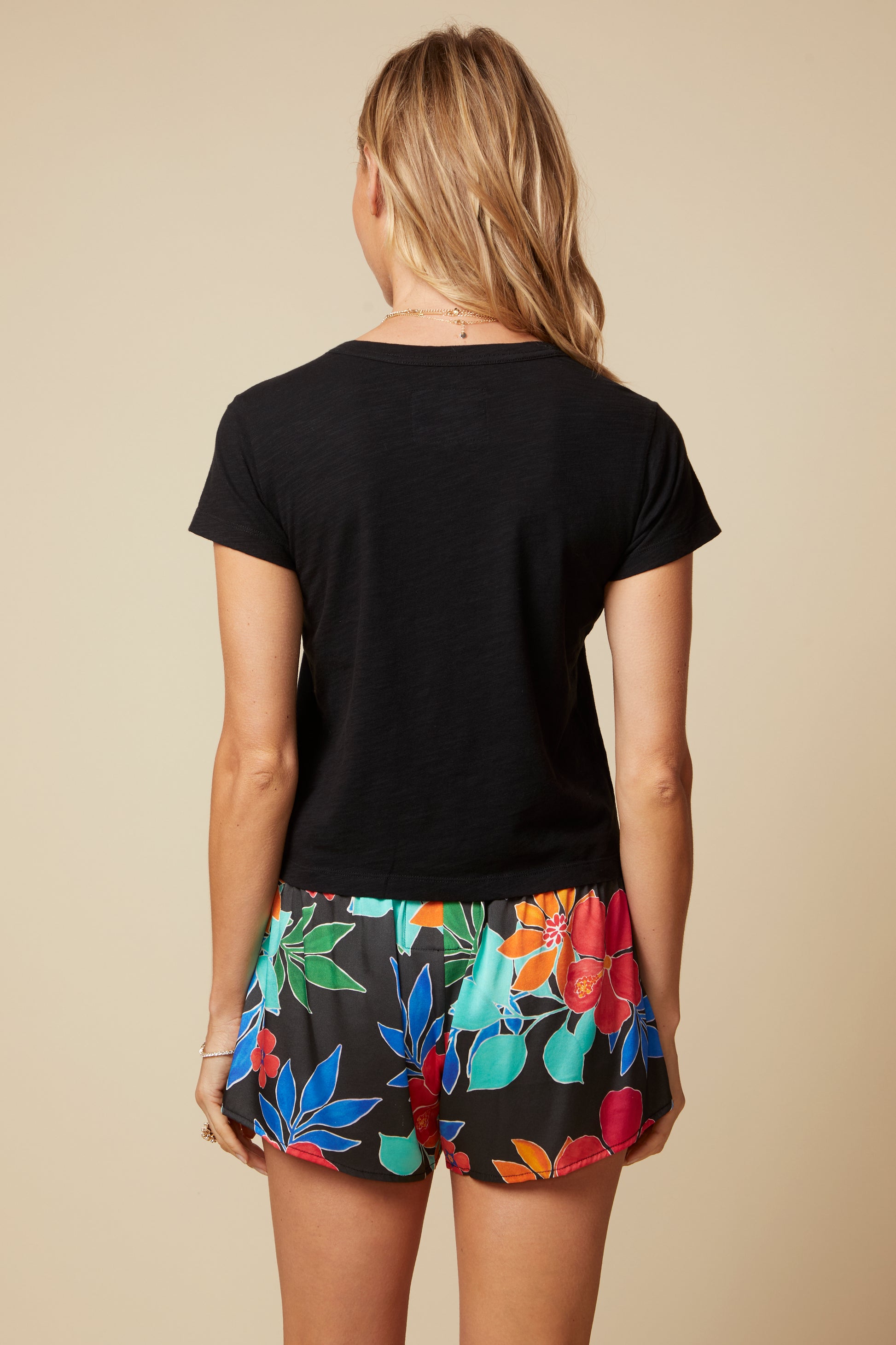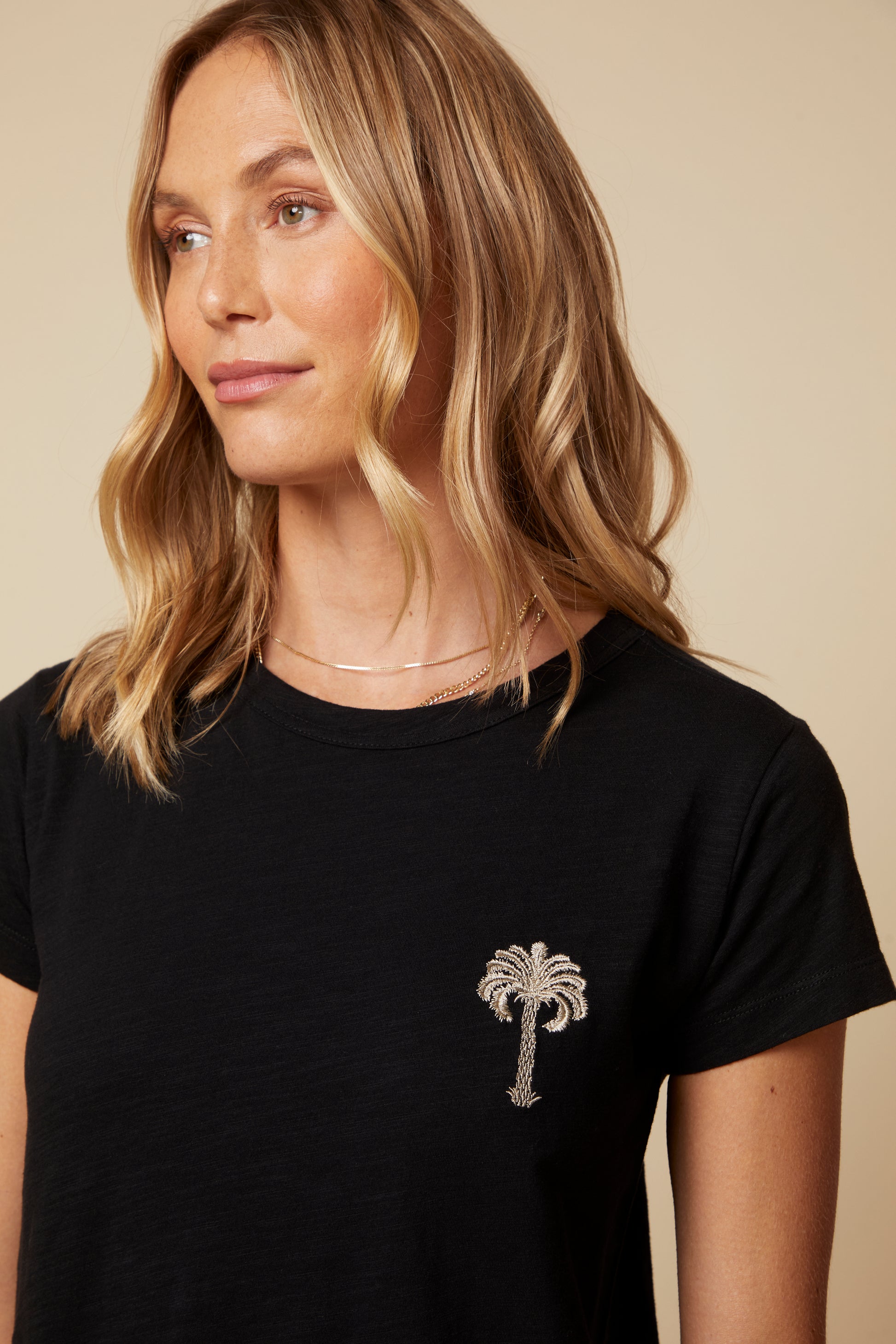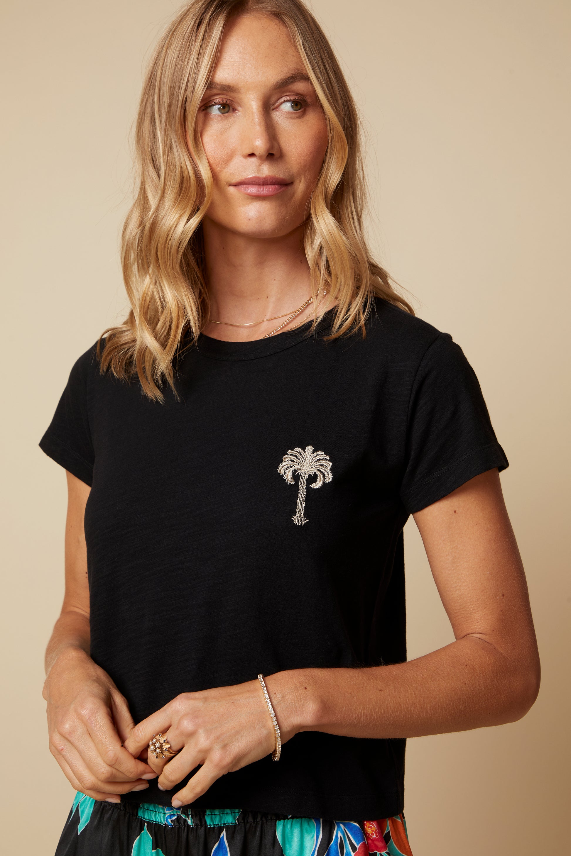 A Vintage Inspired, Classic Tee Silhouette, The Sidney Tee Is The Cherry On The Top Of Your Day. Chic And Classy, This Tee Is Semi-Cropped, With A Shrunken Sleeve And A Relaxed And Easy Fit Bodice. In 100% Cotton Slub Jersey, The Fabric Is Soft And Breathable. Throw On With High Waisted Jeans To Elevate Your Look Or Pair With A Mini Skirt Or Silk Pant For A More Uptown Vibe. The Sidney Always Turns Heads. Signature Royal Palm Tree Embroidery In Gold Thread Elevates This Style In Brand Heritage And Legacy. The Vintage Washed Black Color Makes This Essential Style A Classic. This Style is Semi-Cropped, Size Up for a Longer Fit.